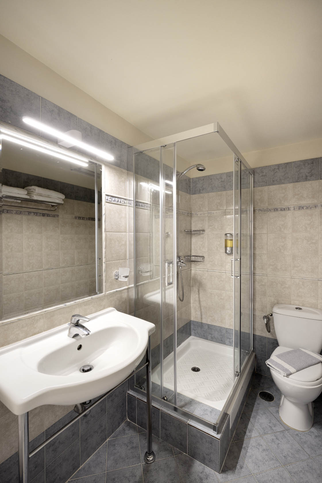 The room features a double bed or two singles, elegant decor, a private balcony, air conditioning, and all modern amenities—from a coffee maker and satellite TV to a comfortable bathroom with shower. Surrender to the understated charm of the space and feel at home, with every detail thoughtfully designed for your enjoyment.