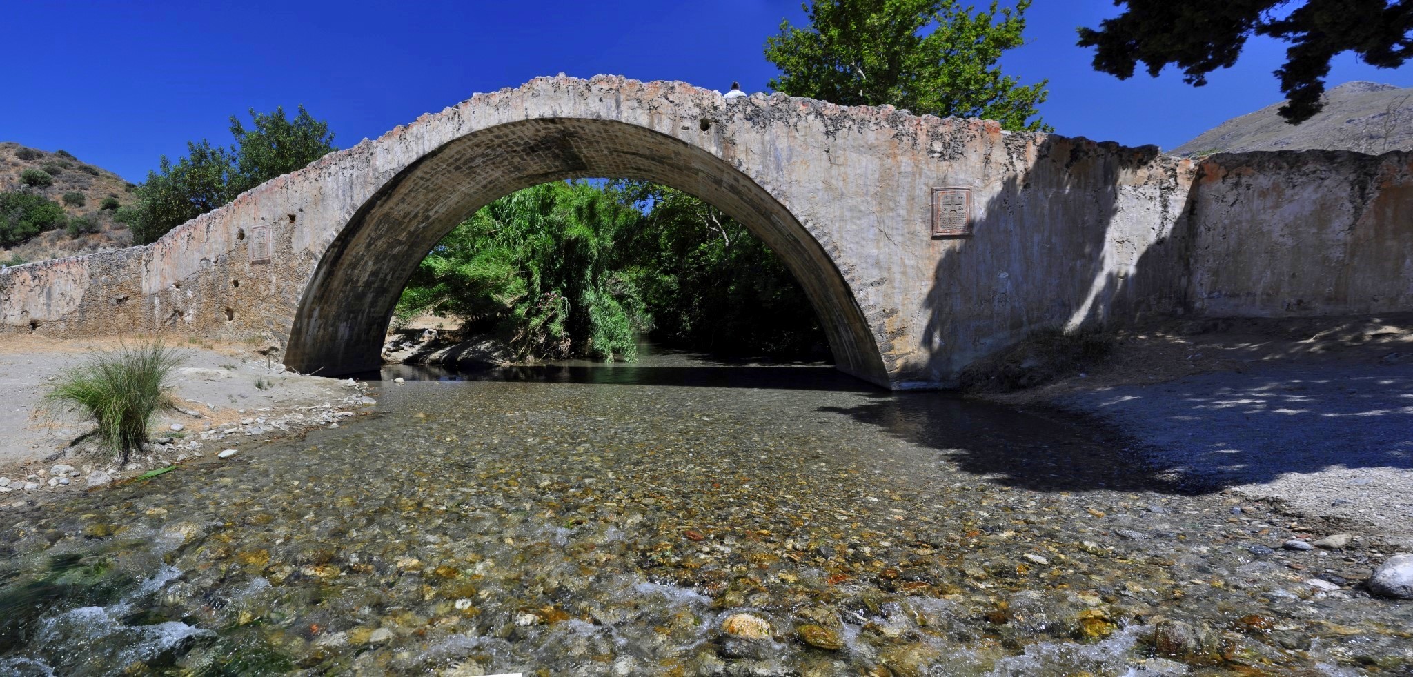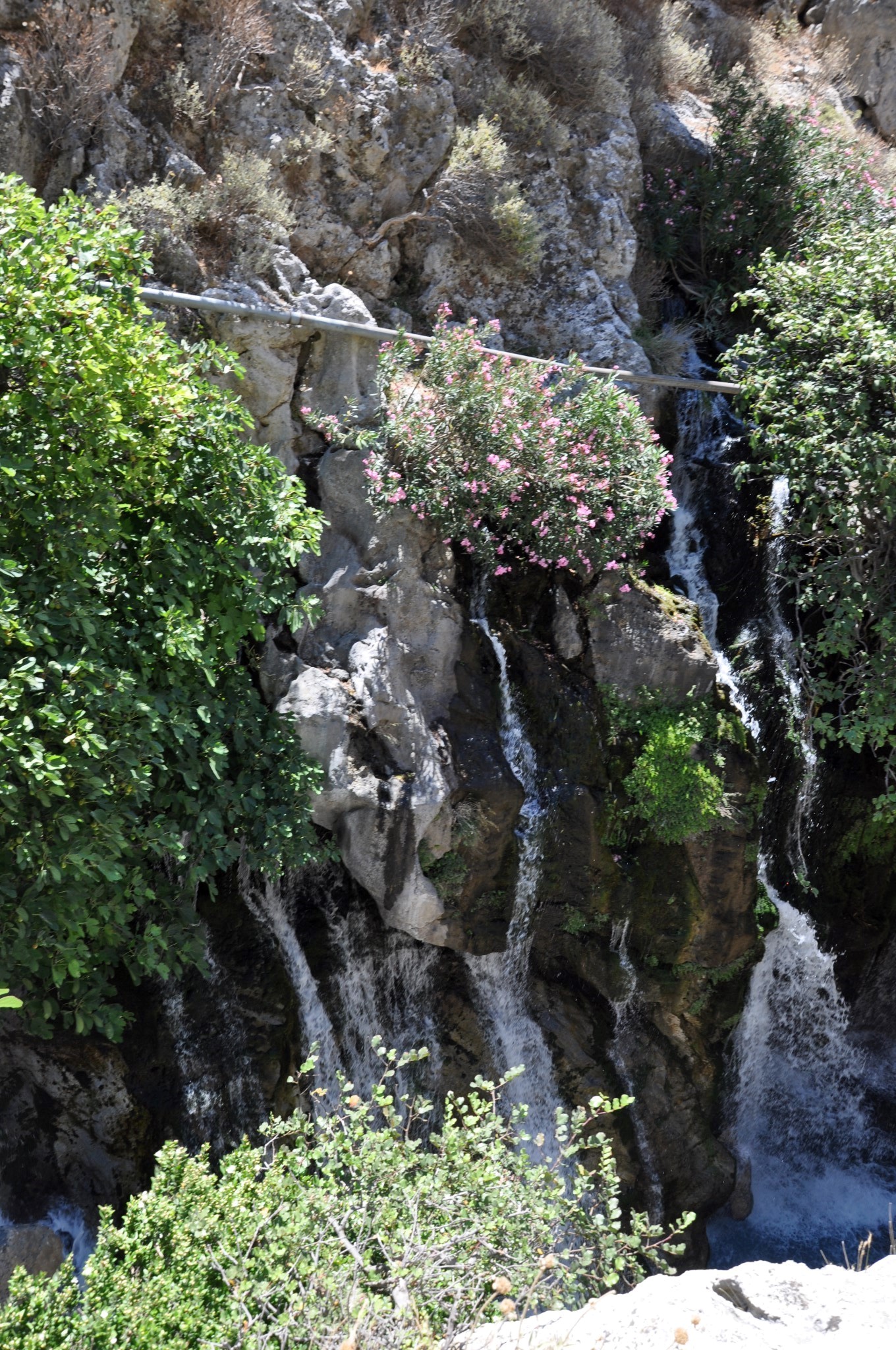 The canyon is crossed by a paved road. By following the steps at the side of street Koxare – Asomatos, you reach the bottom of the gorge, where the church of local saint Nicholas Kourtaliotis is located. The springs of Kourtaliotis, near the chapel, are one of the nicest attractions of the gorge. Just below the springs is the amazing waterfall of Kourtaliotis with a large flow of water in a very narrow and dark part of the gorge, which can be reached by swimming from a lower level of the river. From there one can trek in the river to the bridge of the Megalos River and then to the sea to the palm beach Preveli.